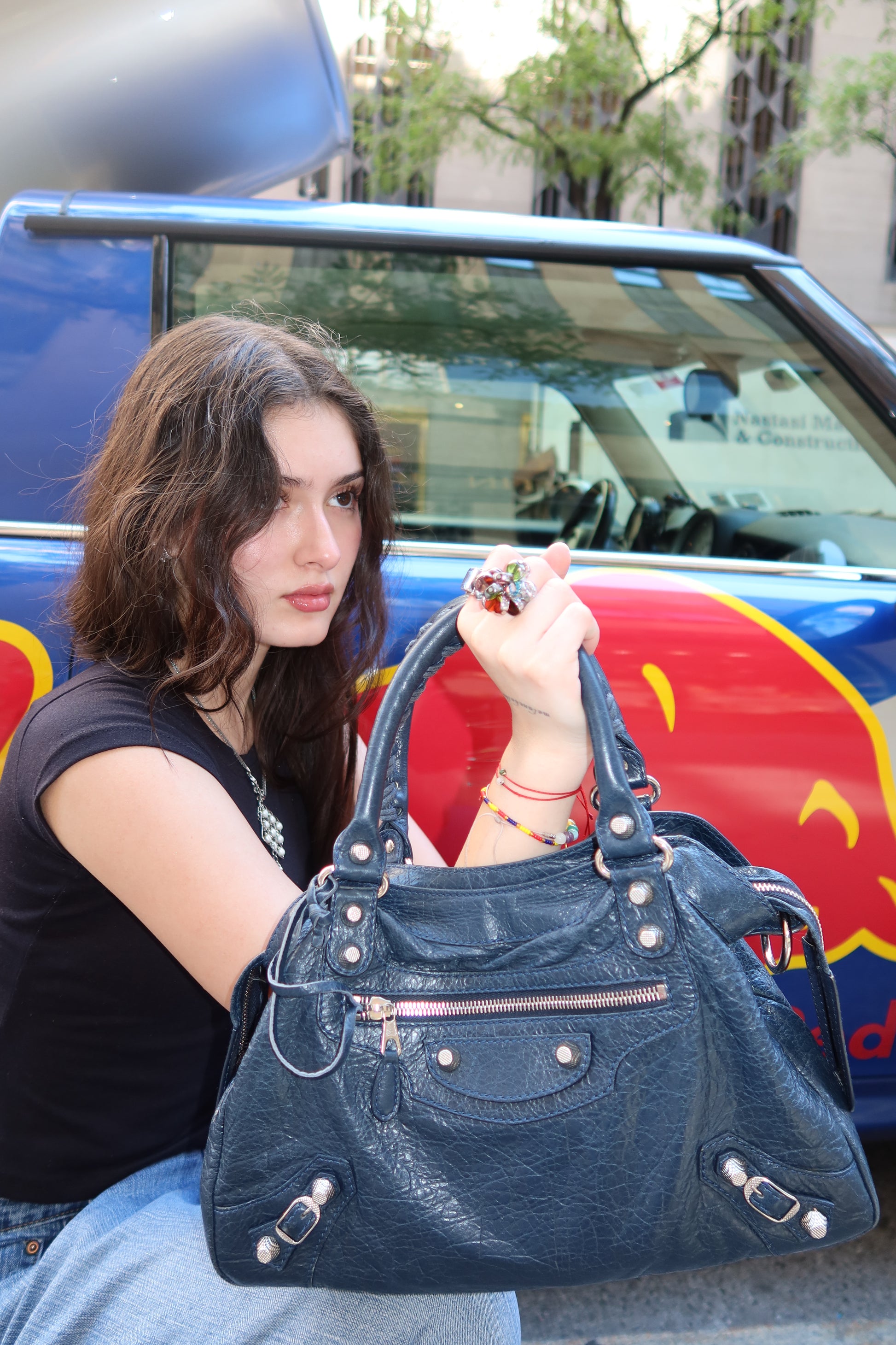 The Balenciaga City Bag is an iconic piece that defined 2000s fashion with its slouchy silhouette, motorcycle-inspired details, and edgy yet chic aesthetic. This navy blue version with silver hardware is a versatile statement piece that pairs effortlessly with any look.