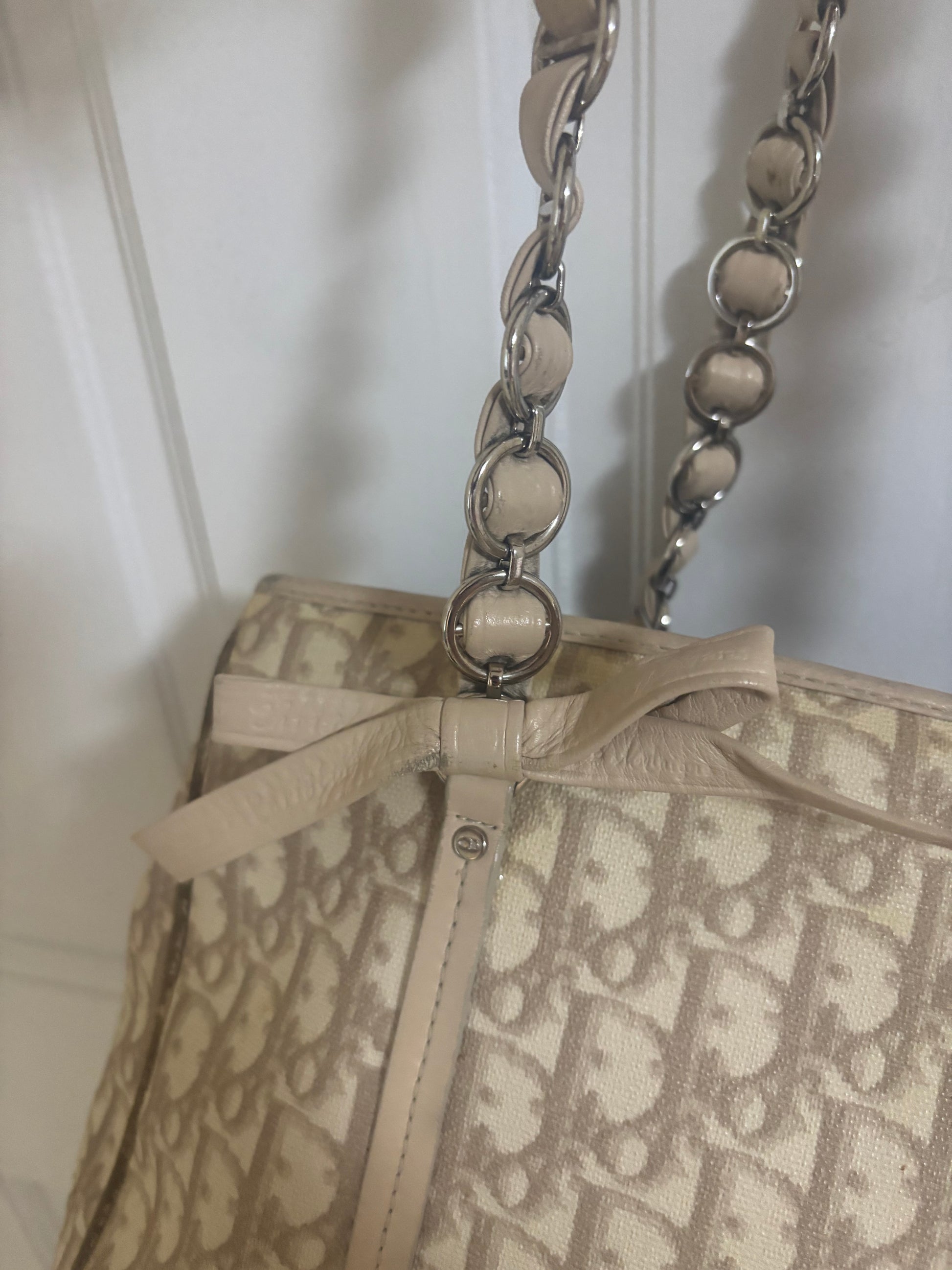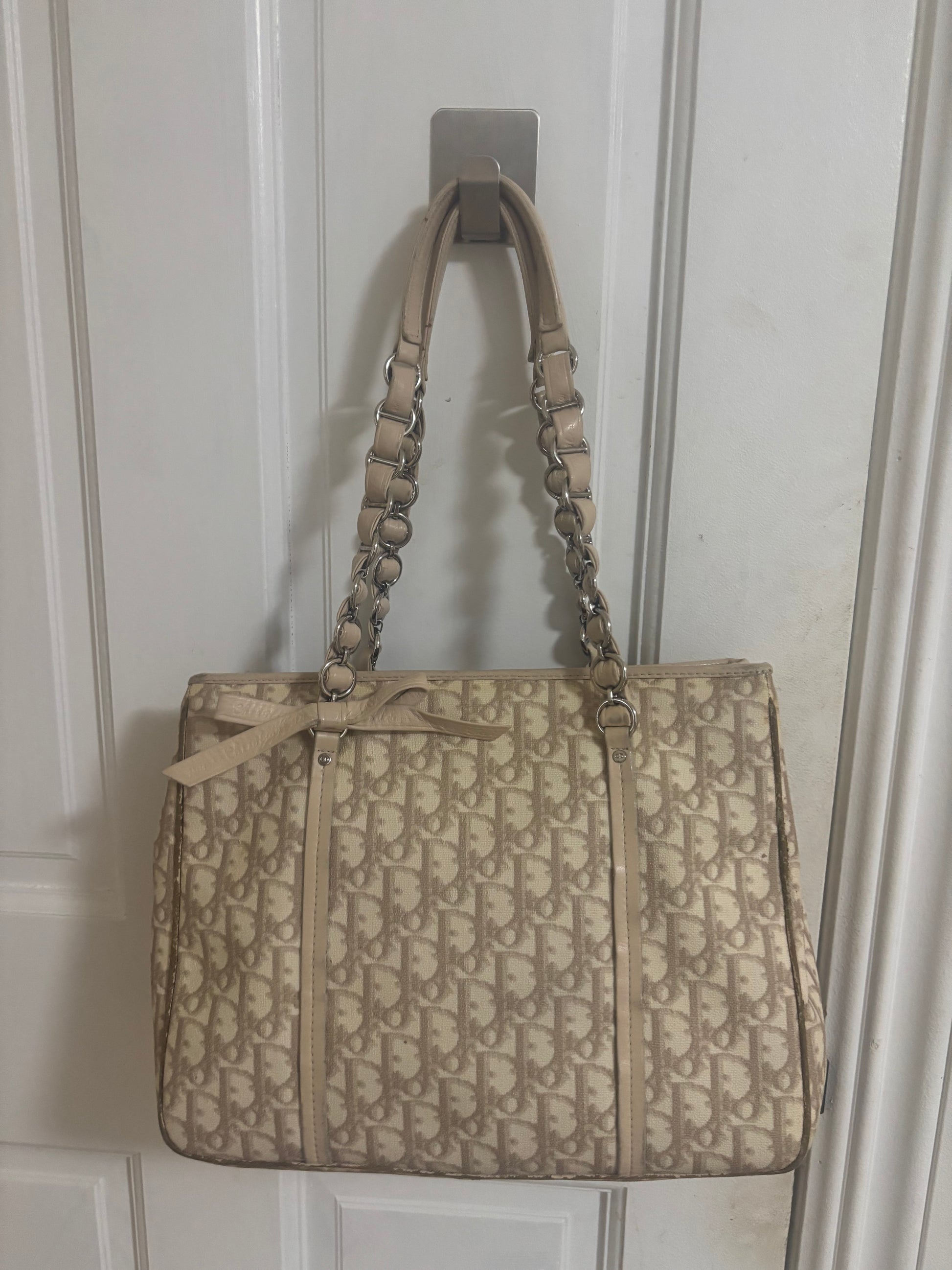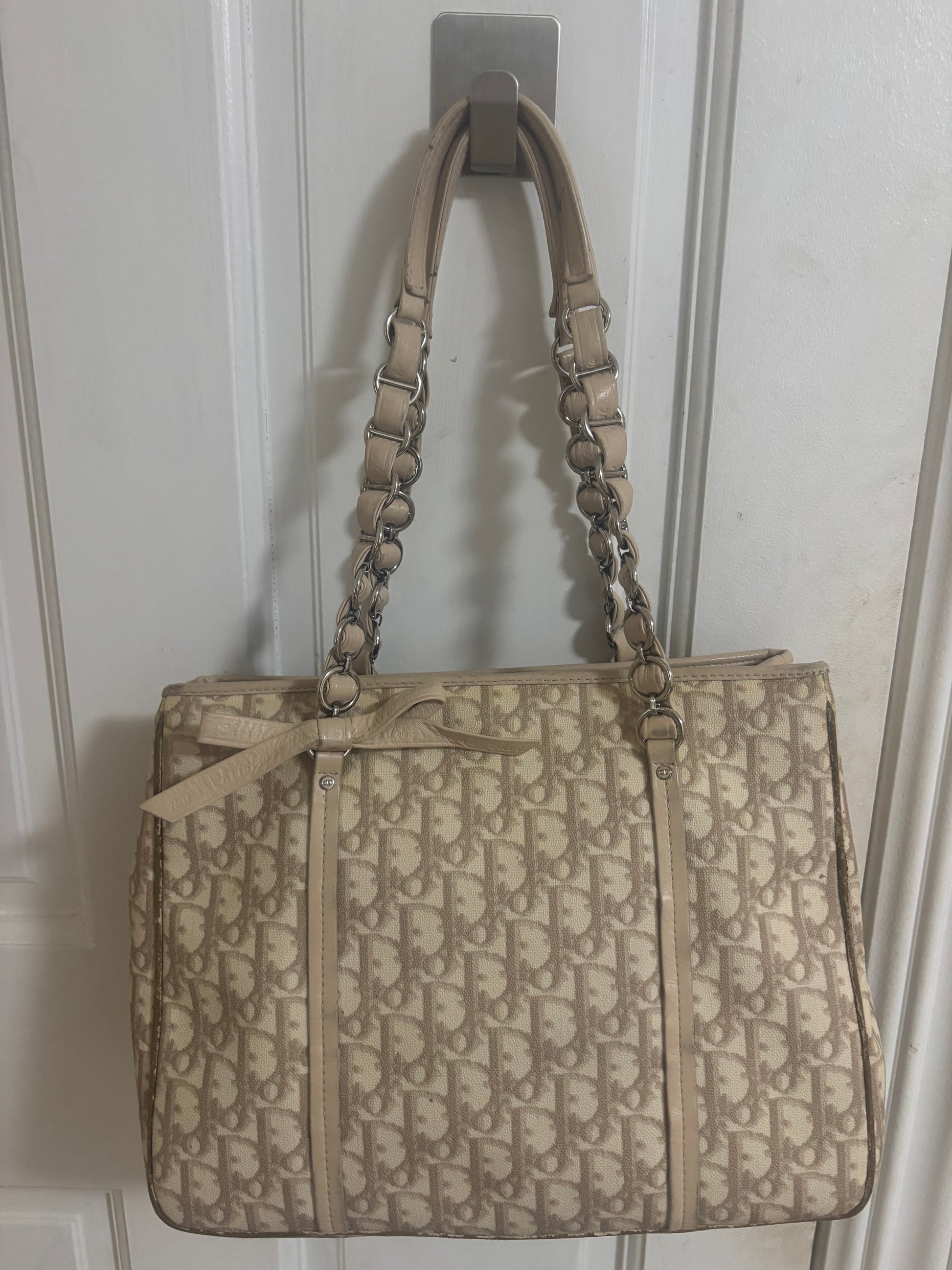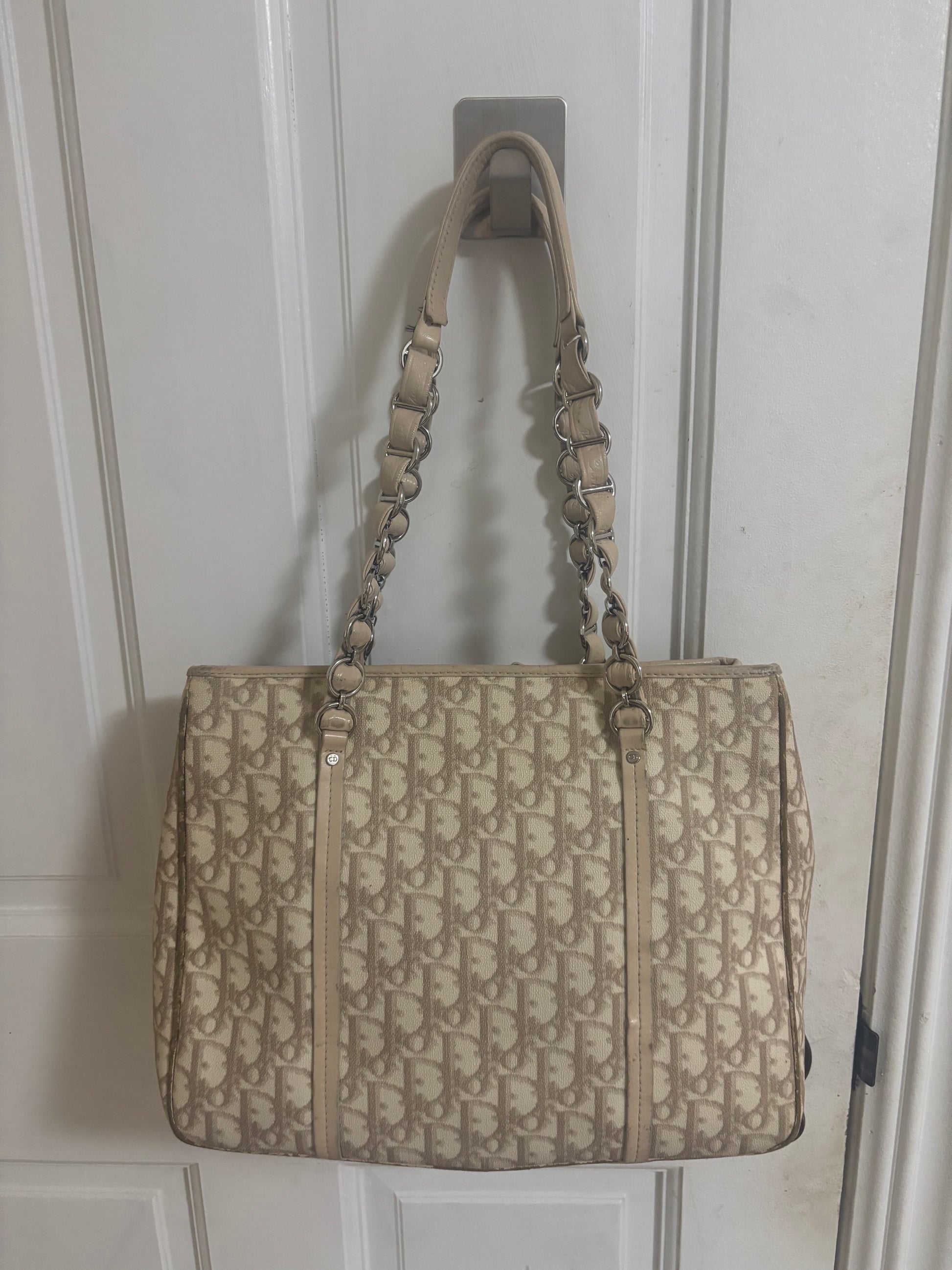 Step into timeless elegance with this authentic Dior tote in the iconic beige Dior Oblique canvas. A true vintage gem from the early 2000s, this bag combines chic Parisian style with everyday practicality.