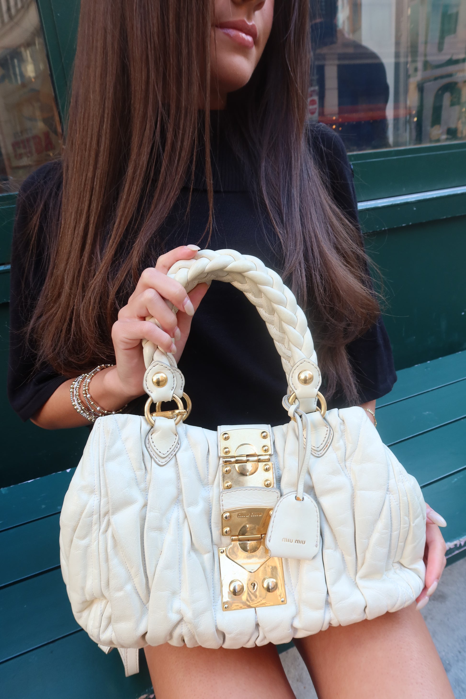 An iconic piece from the golden era of 2000s fashion — the Miu Miu Matelassé Coffer Bag in cream lambskin leather. Featuring the brand’s signature ruched texture, bold gold hardware, and braided top handles, this bag perfectly captures Miu Miu’s playful yet luxurious aesthetic. The structured flap and oversized clasp give it a statement look that remains endlessly chic today.